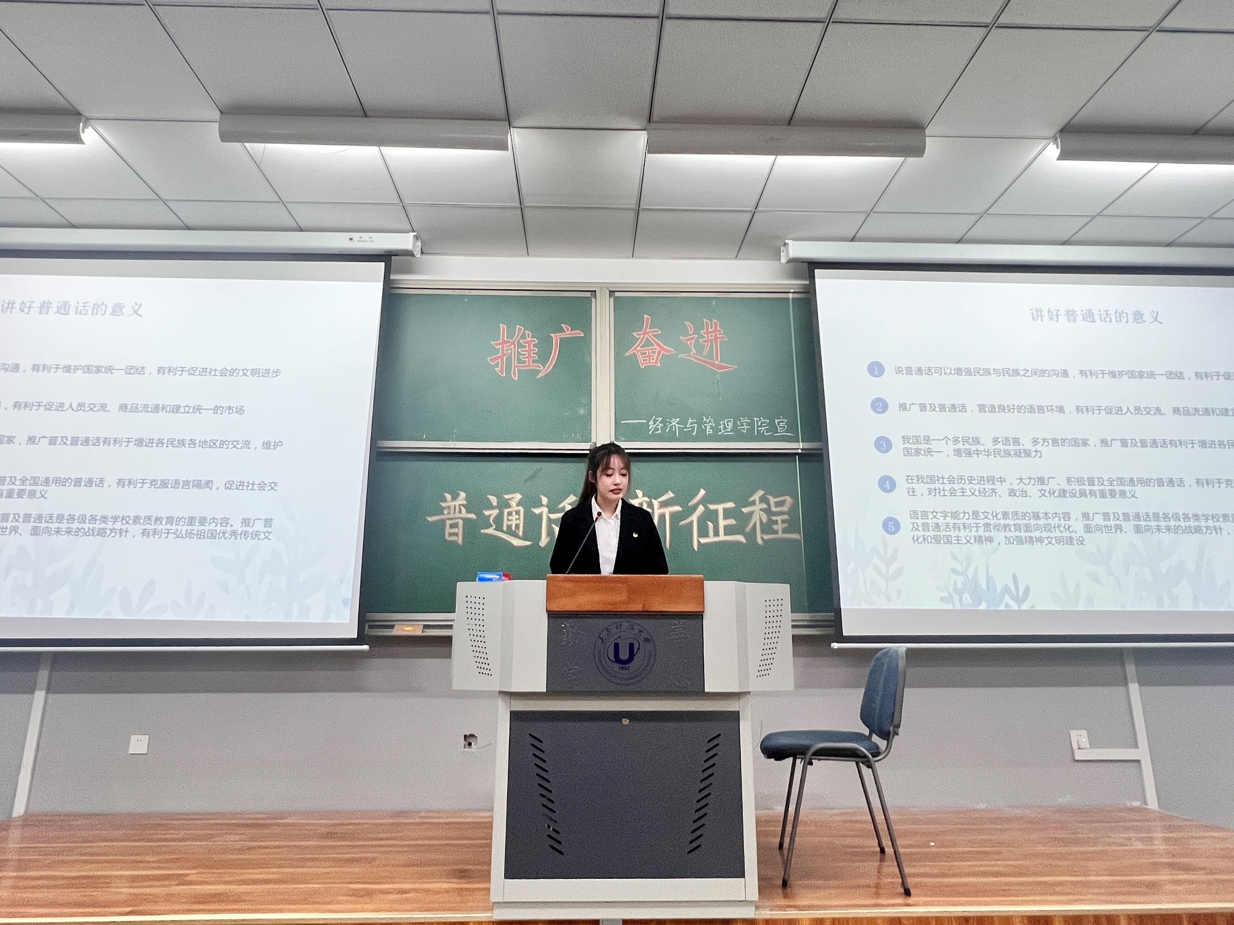 高校承擔(dān)著“為黨育人,為國選材”重任,是推廣普通話、使用規(guī)范字的重要場所。我校各學(xué)院積極開展團(tuán)日活動、班會、線上培訓(xùn)、線下宣講會等活動,在校園中營造濃厚的規(guī)范用語用字氛圍,揚(yáng)民族文化,樹民族精神,讓校園的每一面墻,每一塊黑板,每一個櫥窗成為規(guī)范文字的鏡子,讓校園的每一個教室,每一堂課成為宣傳普通話的窗口。
