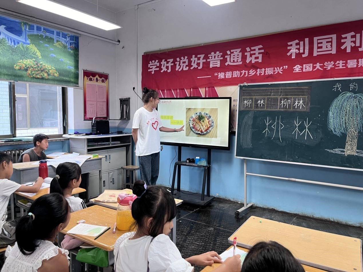 走進(jìn)柳林,推普調(diào)研進(jìn)行時(shí)。推普隊(duì)隊(duì)員們來(lái)到了柳林縣縣城,對(duì)賀昌大街上的交警、保安、藥店醫(yī)生、門店商販等不同職業(yè)和年齡的人群開展國(guó)家通用語(yǔ)言文字使用情況現(xiàn)場(chǎng)調(diào)研。通過(guò)朗讀字詞句、文章、隨機(jī)聊天等形式了解受訪者語(yǔ)音面貌,并逐一核查門店標(biāo)語(yǔ)漢字規(guī)范使用情況,共計(jì)完成調(diào)查問(wèn)卷百余份,為后續(xù)科學(xué)研究提供了有效的數(shù)據(jù)基礎(chǔ)和支持。 賀昌精神永垂不朽,紅色文化賦能推普。推普隊(duì)員們于16日集體參觀賀昌烈士陵園,一同緬懷賀昌將軍,回望崢嶸歲月。隊(duì)員們通過(guò)參觀賀昌將軍紀(jì)念館,深入了解學(xué)習(xí)了賀昌將軍的英勇事跡,依托柳林豐富的紅色文化資源,在普通話教學(xué)課程中,融入紅色文化,講好賀昌故事,弘揚(yáng)呂梁精神。 直播“云”推普,連線你我他。隊(duì)員們利用抖音平臺(tái)進(jìn)行網(wǎng)絡(luò)直播宣傳和推廣,通過(guò)有感情朗讀散文、背誦古詩(shī)、朗讀繞口令等形式吸引了大量線上觀眾,還與來(lái)自湖南、遼寧、青海等全國(guó)不同省市的主播連麥PK,線上糾正對(duì)方前后鼻音不分、平翹舌不分的常見發(fā)音問(wèn)題,直播間共計(jì)一萬(wàn)余人次觀看,這一形式有效擴(kuò)大推普影響力,拓寬宣傳推普渠道,營(yíng)造良好推普氛圍。 傳統(tǒng)文化進(jìn)課堂,柳林特色展風(fēng)采。推普隊(duì)隊(duì)員將發(fā)生在柳林的神話故事、楊家將英勇事跡、非遺文化碗團(tuán)、賀昌紅色精神融入日常課程中,力求在日常教學(xué)中,立足柳林當(dāng)?shù)靥厣幕ㄟ^(guò)講述中華優(yōu)秀傳統(tǒng)文化典故,培養(yǎng)學(xué)生對(duì)傳統(tǒng)文化的熱愛,厚植愛國(guó)情懷。 此次“三下鄉(xiāng)”社會(huì)實(shí)踐活動(dòng)的意義重大,不僅走入校園提升了焉哉小學(xué)師生整體的普通話水平,同時(shí)激發(fā)了柳林縣當(dāng)?shù)厝罕妼W(xué)習(xí)普通話、寫好規(guī)范字的熱情,團(tuán)隊(duì)通過(guò)十余種不同形式推廣普通話、助力鄉(xiāng)村振興的活動(dòng),切實(shí)落實(shí)國(guó)家通用語(yǔ)言文字的政策,促進(jìn)農(nóng)村地區(qū)與城鎮(zhèn)的交流,真正完成推廣普通話助力鄉(xiāng)村振興的任務(wù)和目標(biāo)。在為期七天的實(shí)踐活動(dòng)結(jié)束后,隊(duì)員們收獲頗豐,紛紛表示將繼續(xù)加強(qiáng)對(duì)自身專業(yè)知識(shí)的補(bǔ)充和學(xué)習(xí),希望更好地利用學(xué)科優(yōu)勢(shì)和專業(yè)優(yōu)勢(shì),助力國(guó)家通用語(yǔ)言文字的普及與推廣,用專業(yè)素養(yǎng)詮釋推普之責(zé),用行動(dòng)展現(xiàn)青年擔(dān)當(dāng),為鄉(xiāng)村振興貢獻(xiàn)更多的的青春、智慧和力量。