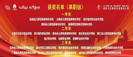 2024年9月19日——22日,第二屆“吾愛吾師杯”高校大學(xué)生語言文化素養(yǎng)與普通話大賽決賽在西寧城市職業(yè)技術(shù)學(xué)院舉行。太原幼兒師范高等??茖W(xué)?;A(chǔ)教學(xué)部選拔出的衛(wèi)小卉、李佳怡、張佳心三位同學(xué),在指導(dǎo)老師雷虹、張敏、趙麗君的精心指導(dǎo)下,憑借標(biāo)準(zhǔn)的普通話、出色的表達能力和良好的綜合素質(zhì),經(jīng)過緊張激烈的角逐,在決賽中脫穎而出,拔得頭籌,榮獲高職組一等獎!